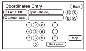 The coordinates destination entry method lets you select a destination by entering latitude and longitude coordinates.